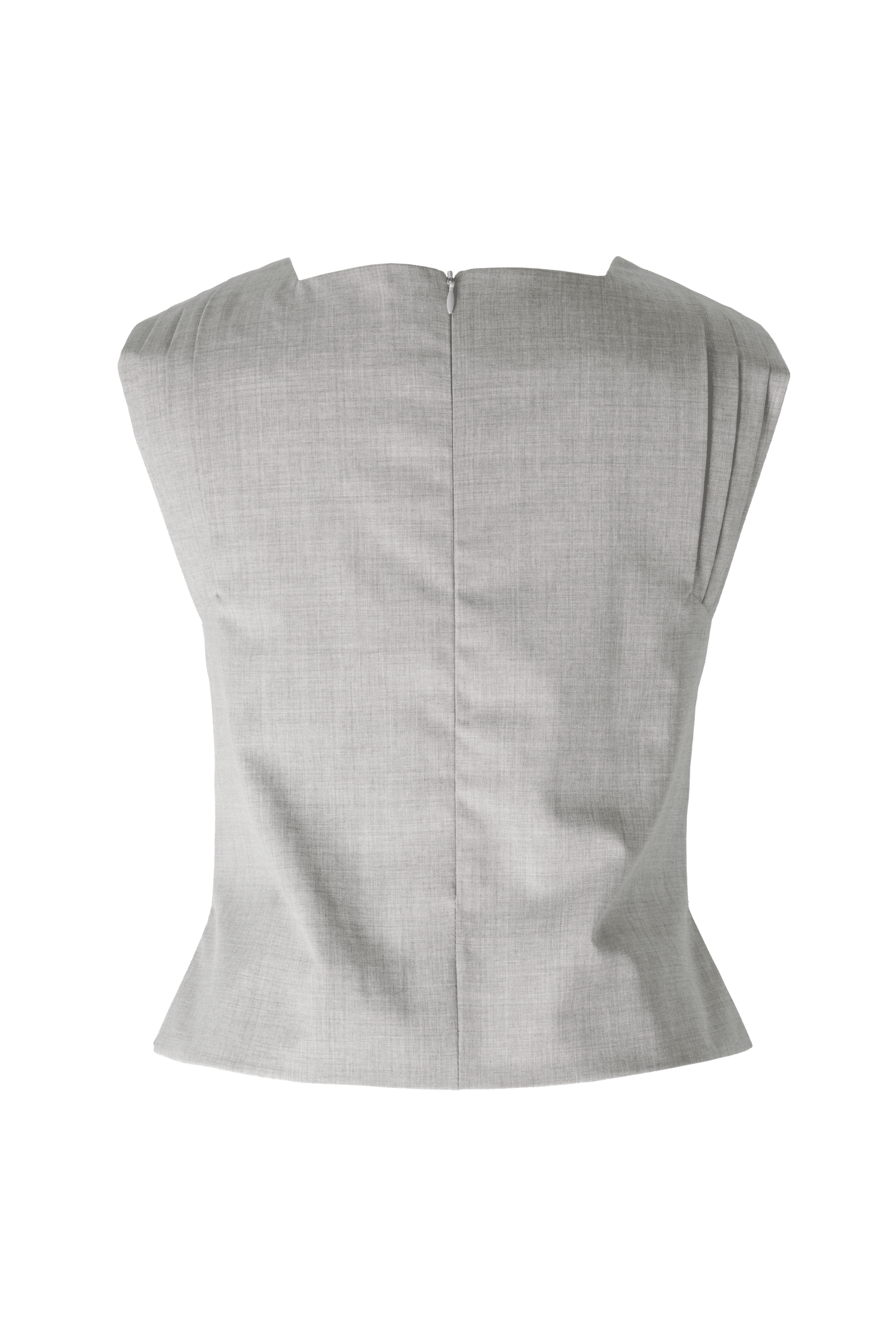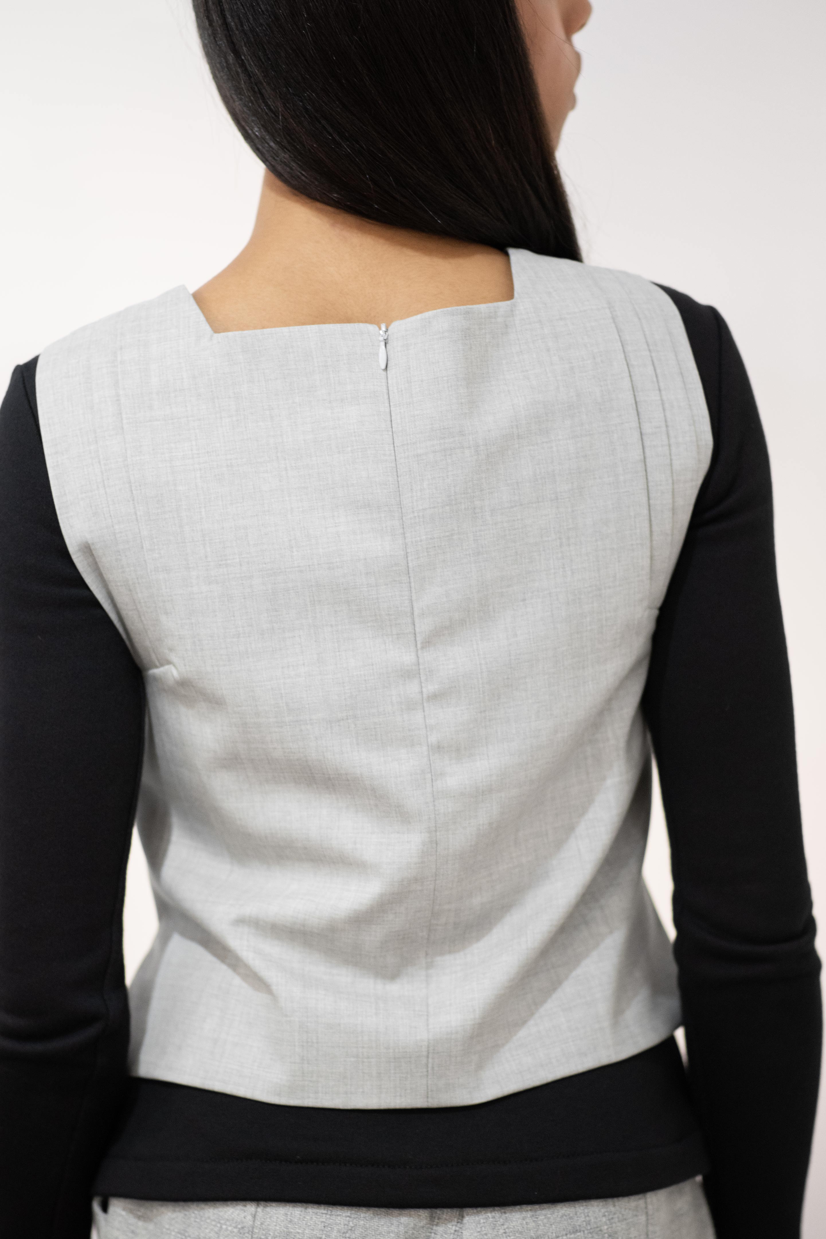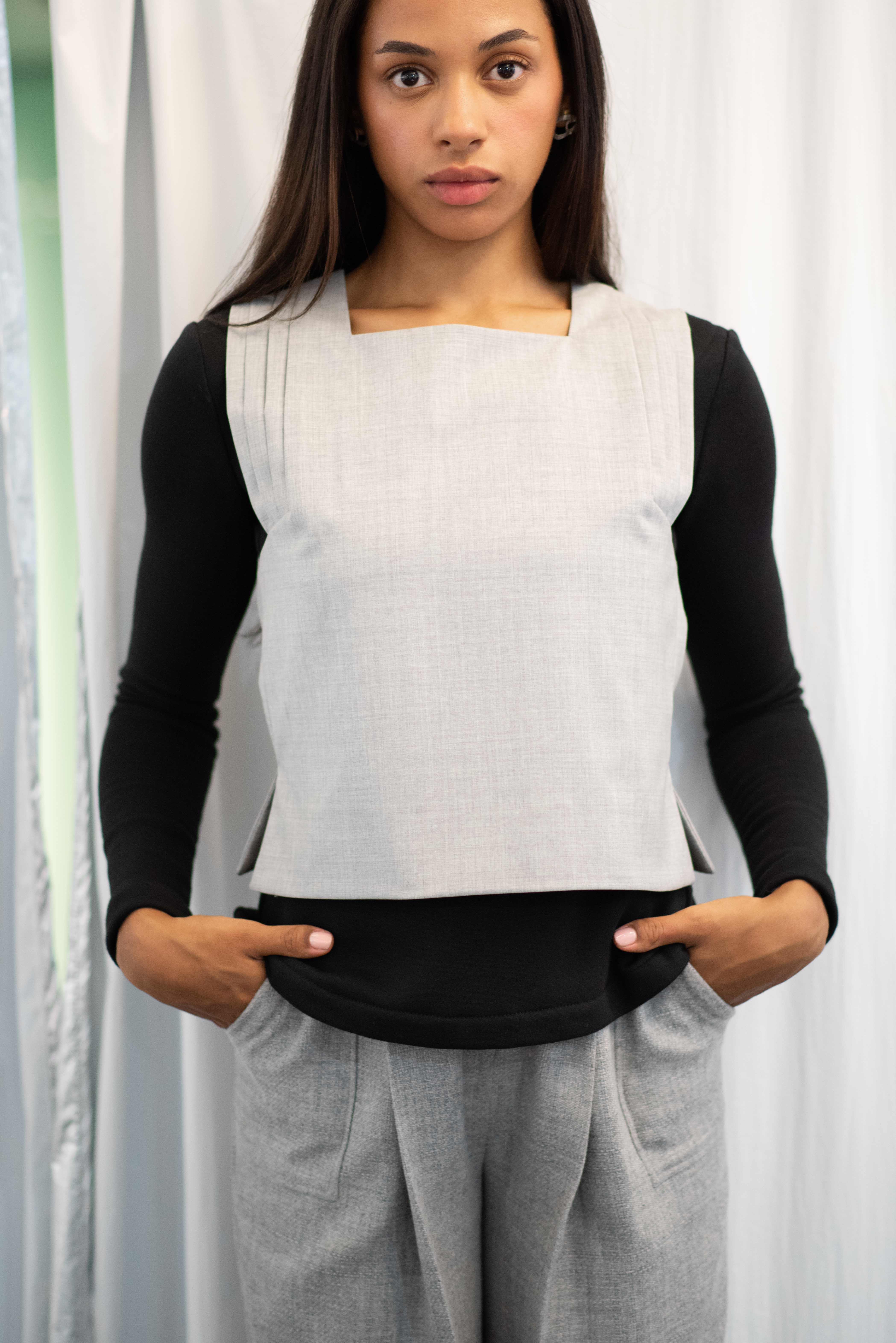 Moonlight Waves No.1 is a versatile gilet that can be effortlessly styled in a modern way. The structured pleating around the armholes adds a refined touch to the straight silhouette, featuring small side slits. Perfect for various outfits, it combines elegance and comfort.