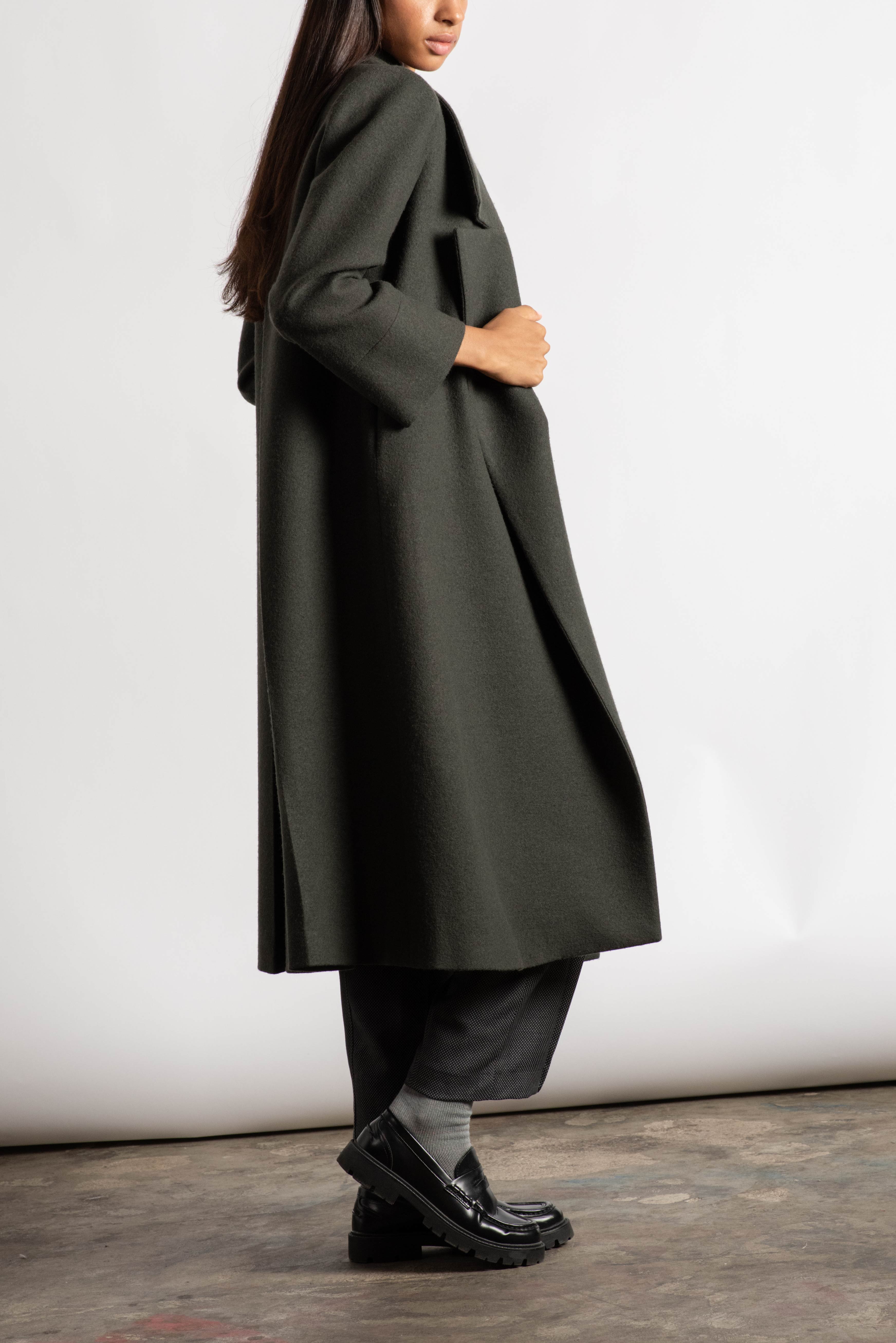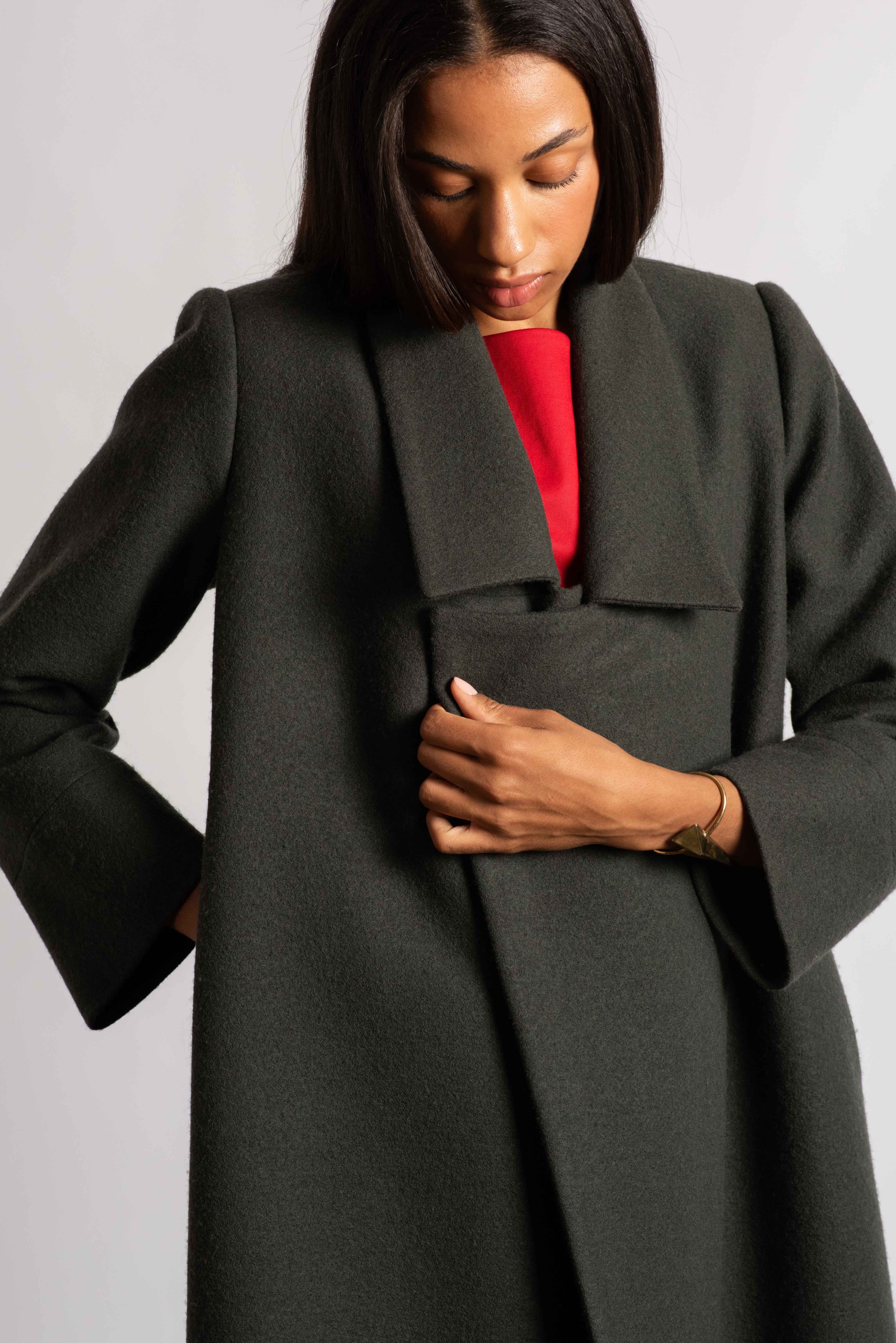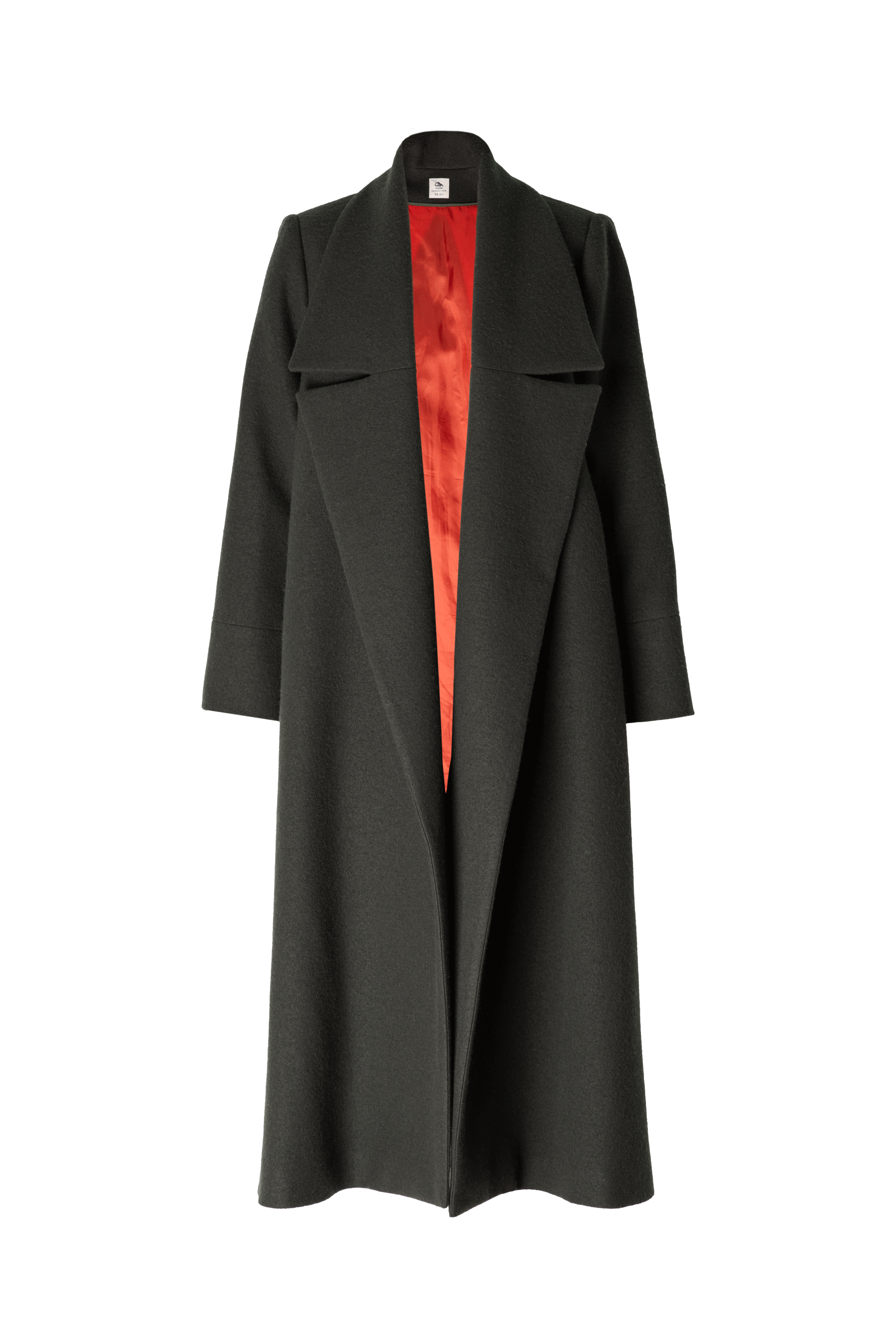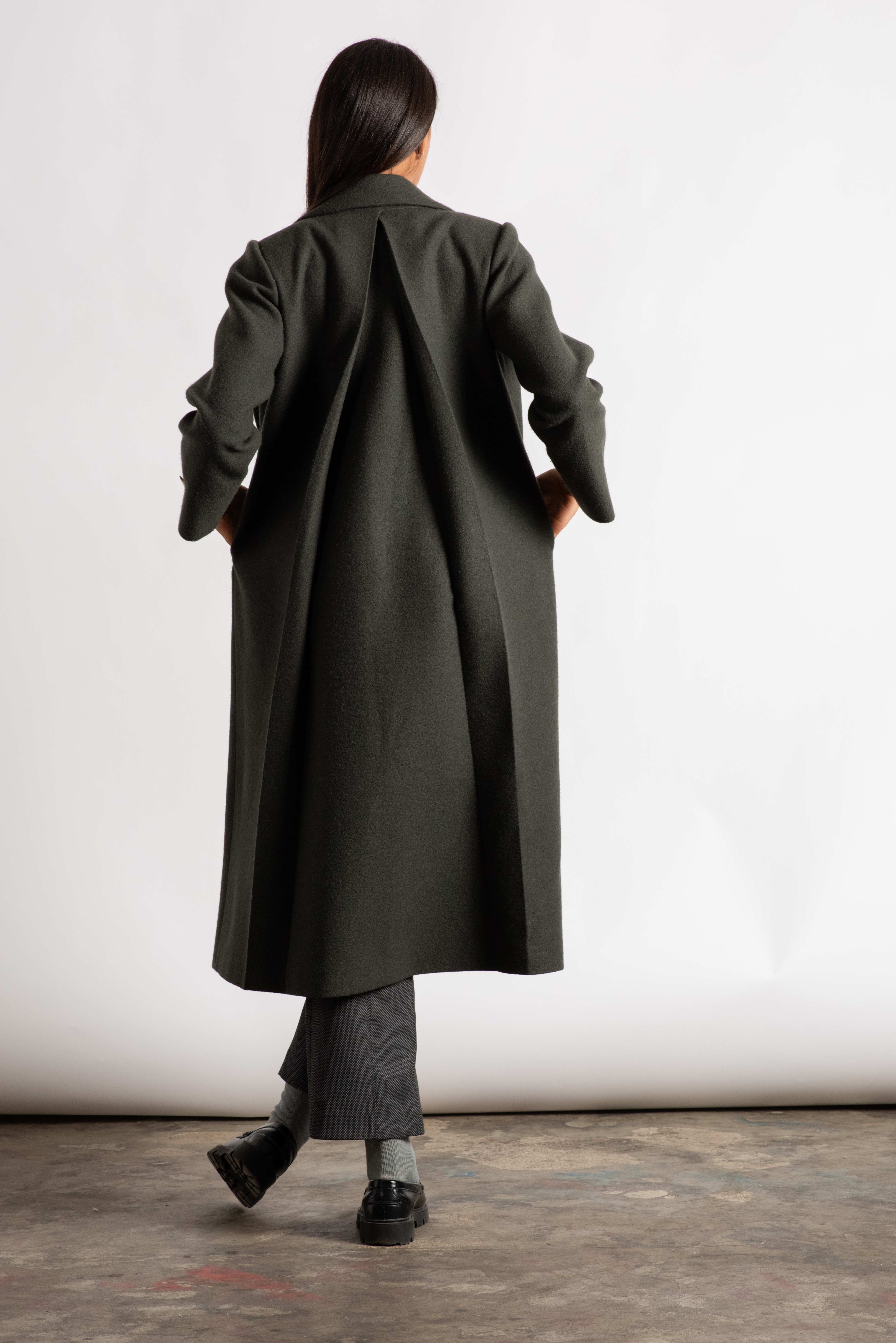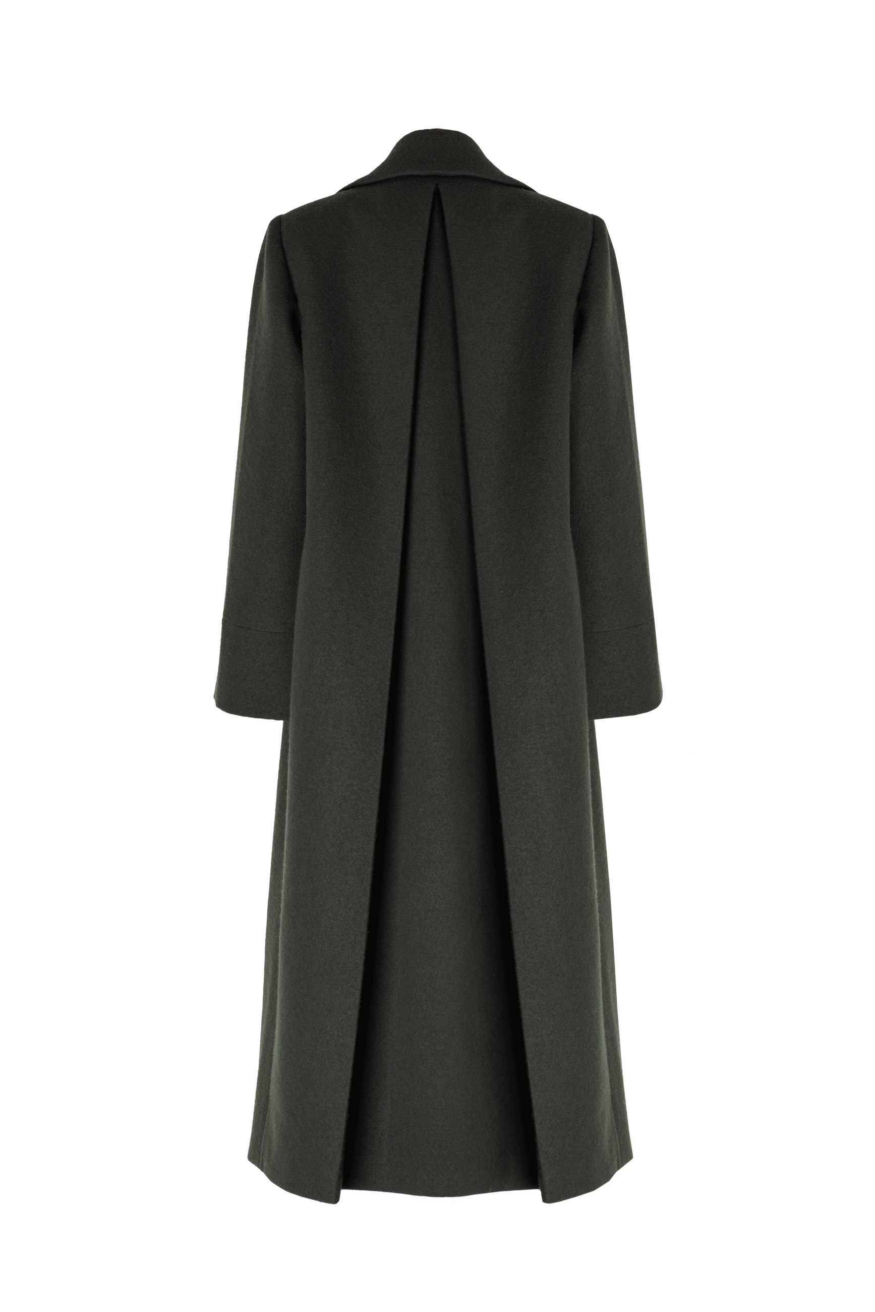 Moonshimmer Rose No.2 is a long coat that stands out with its distinctive, oversized collar. A unique pleat starts at the back just below the collar, gradually widening and disappearing elegantly at the bottom of the coat. This design seamlessly blends classic elegance with modern elements, making it a timeless piece for any wardrobe.