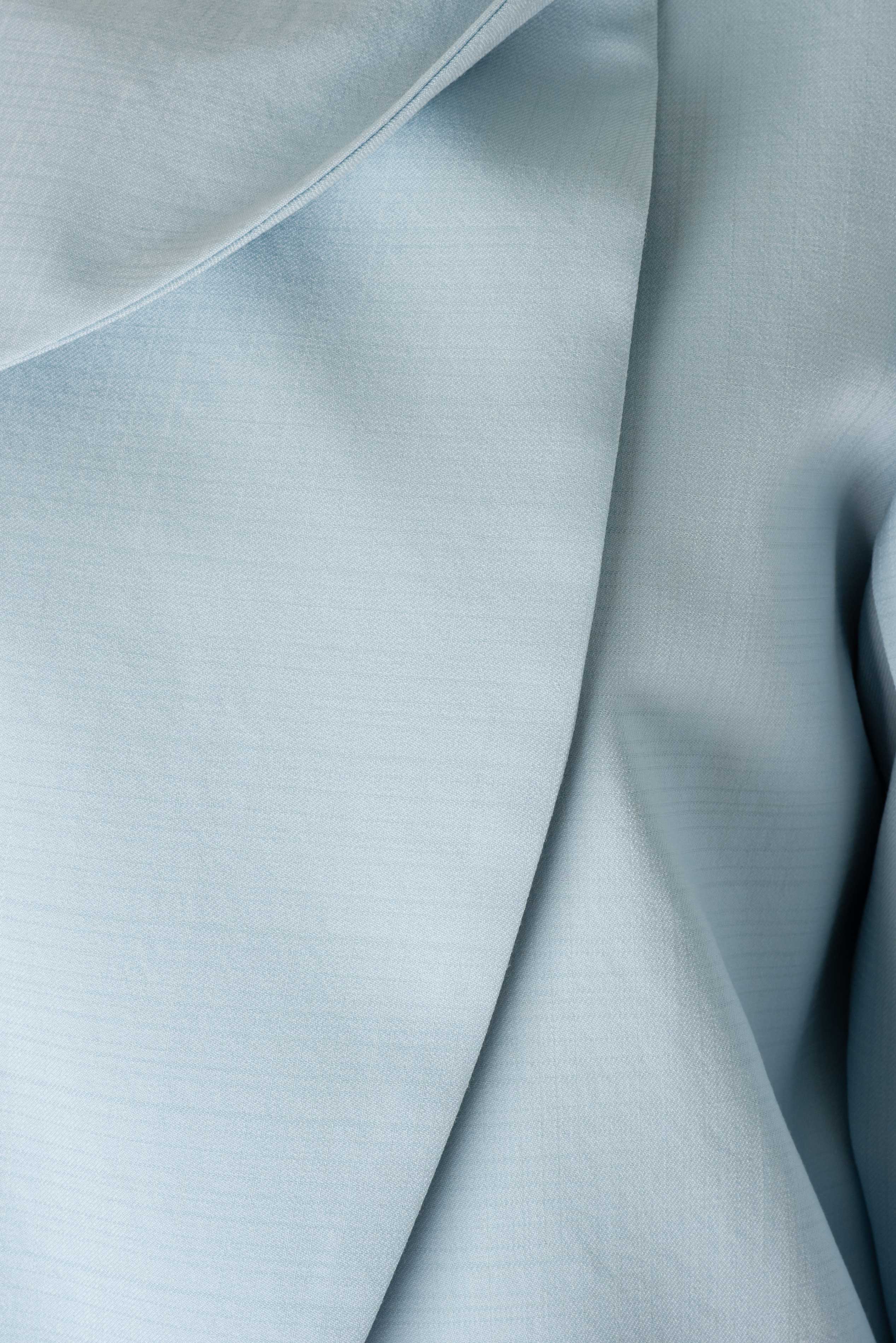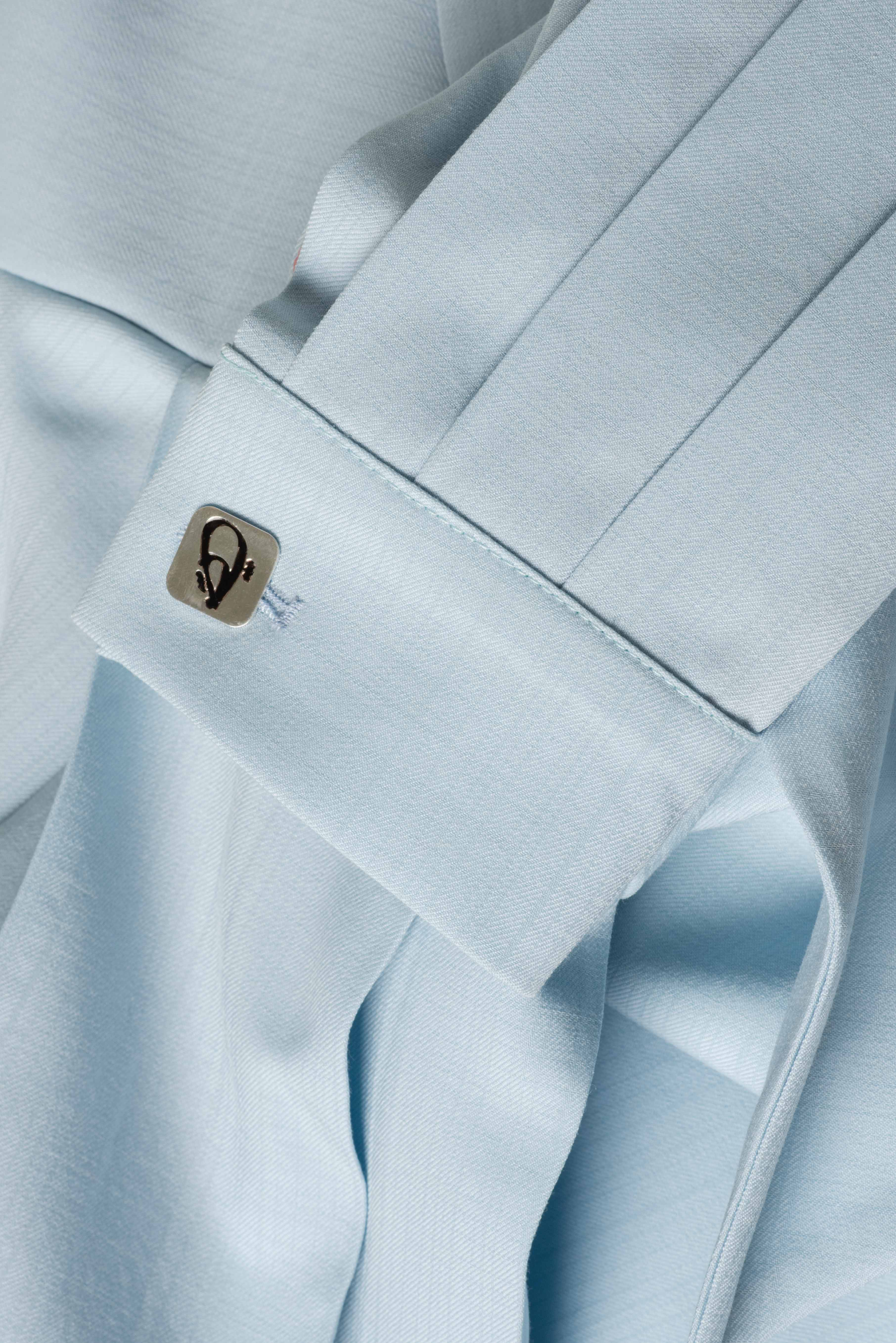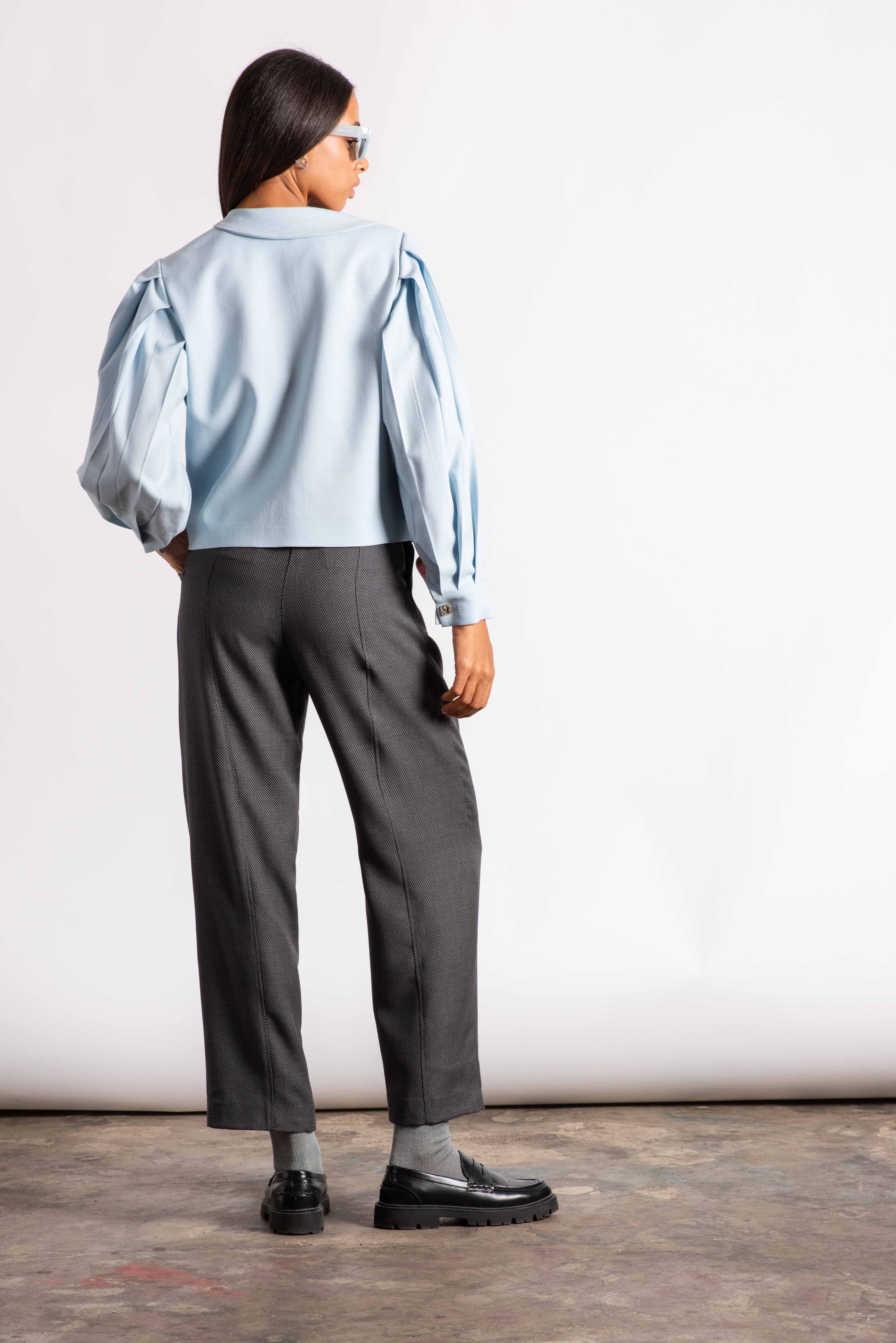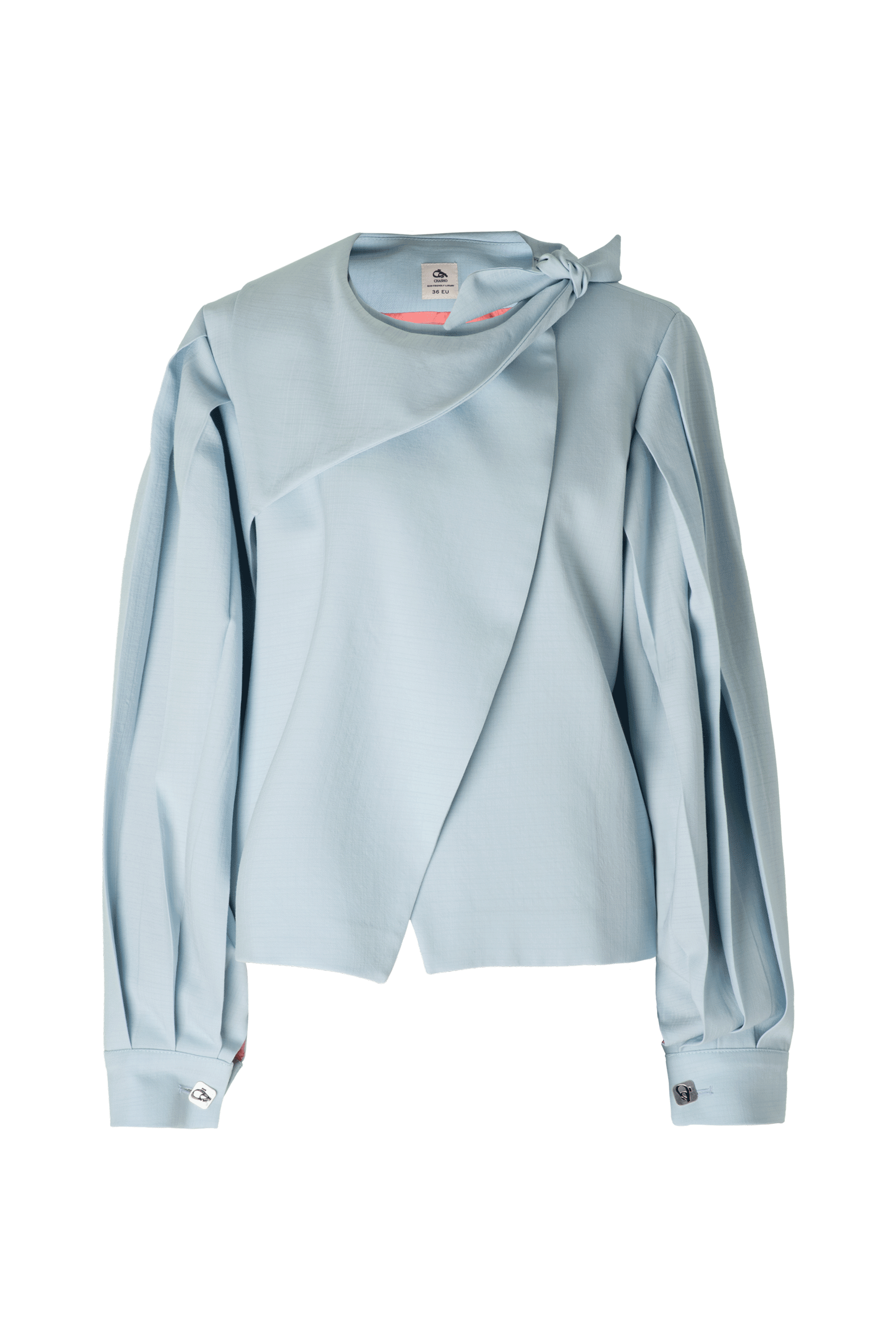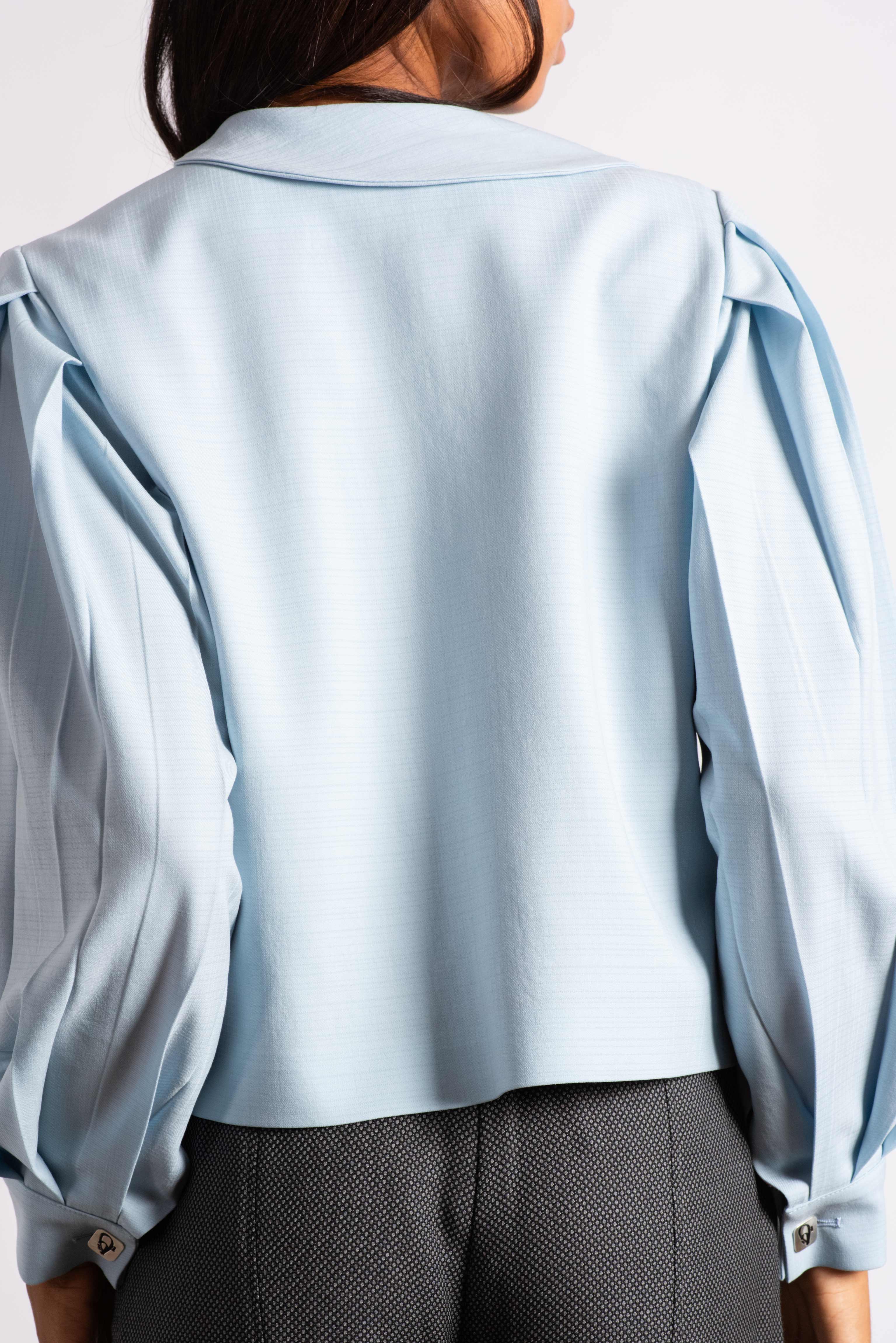 Moon Veil is a blouse that stands out with its wide, pleated sleeves, elegantly fastened at the wrist with cufflinks. The collar and unique front design highlight the distinct style of this piece. Its loose fit, combined with high-quality wool, flatters the body in both motion and stillness, offering a visual delight for both the wearer and those around them.