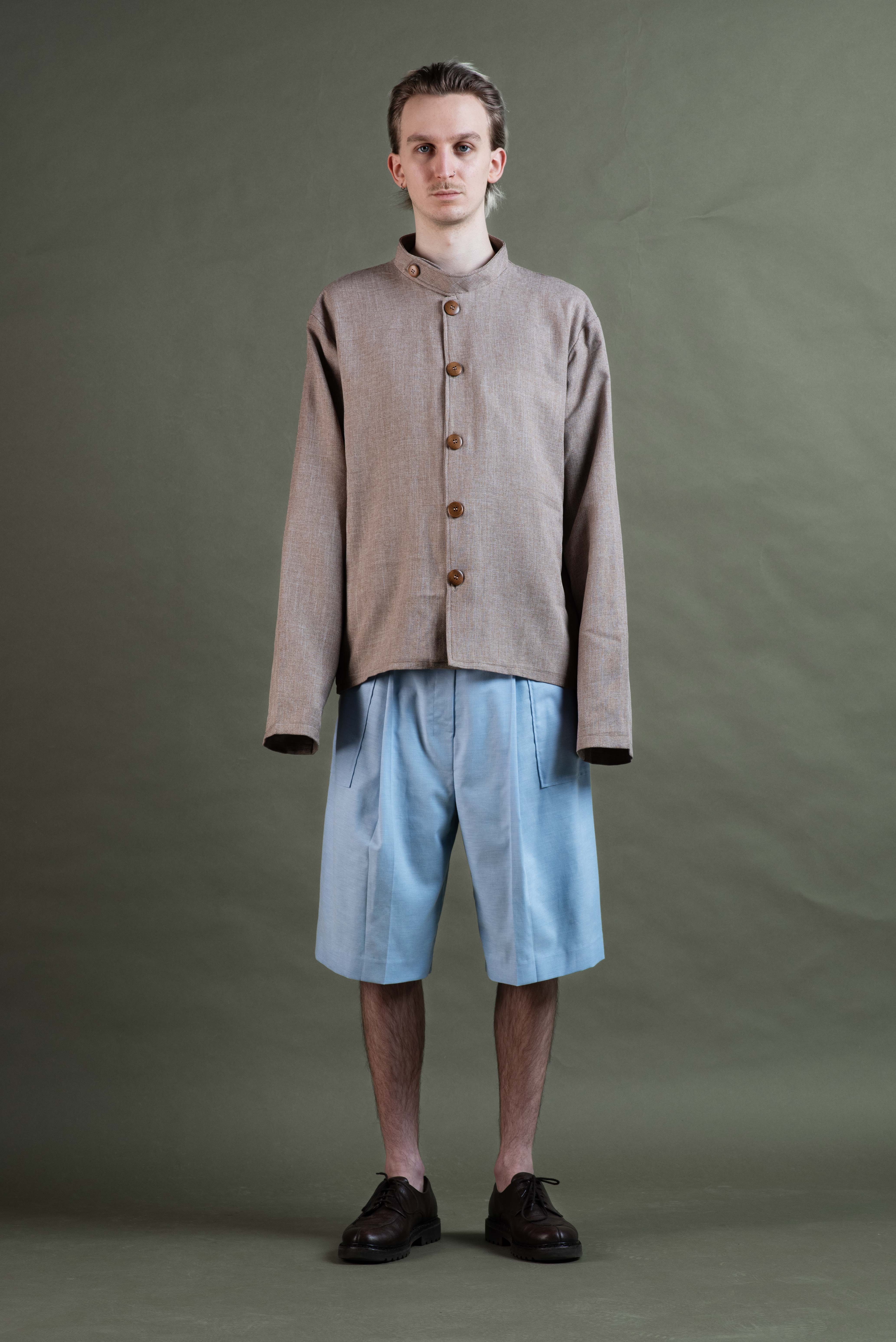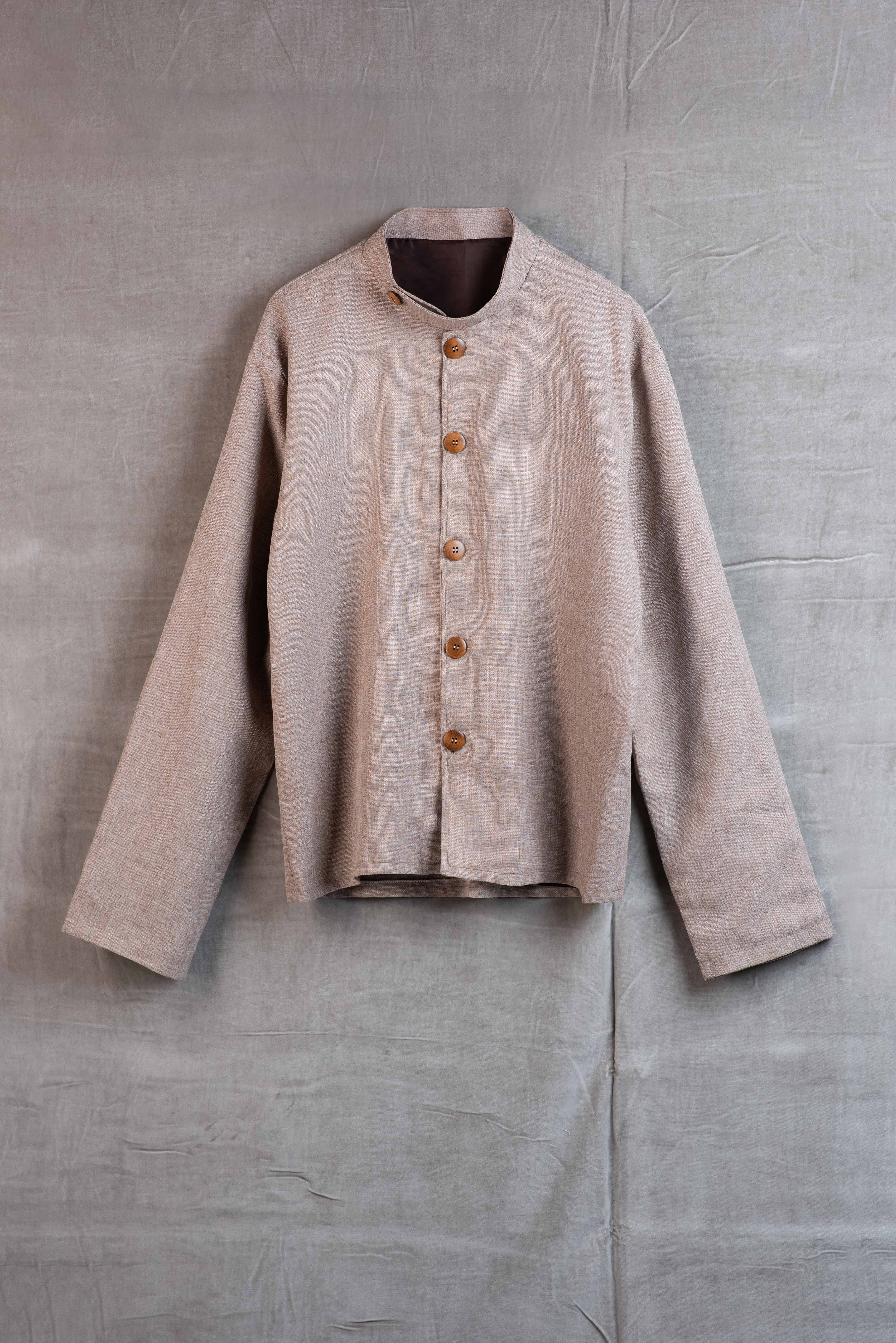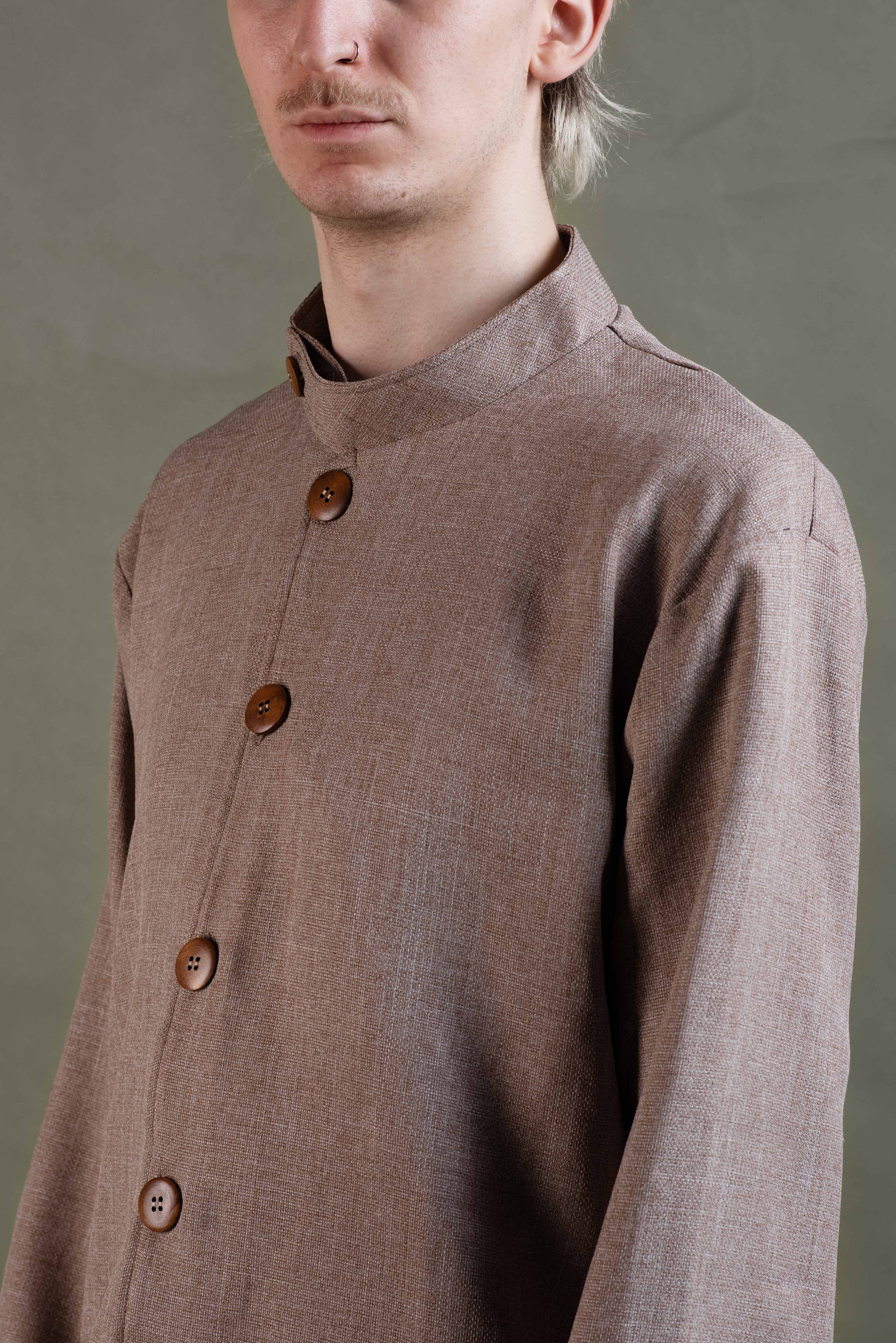 The stand-up collar creates a sharp, modern silhouette, while the wooden buttons complete the sustainable design. Whether worn as a lightweight jacket or an overshirt, Earthshade combines comfort, functionality, and timeless elegance.