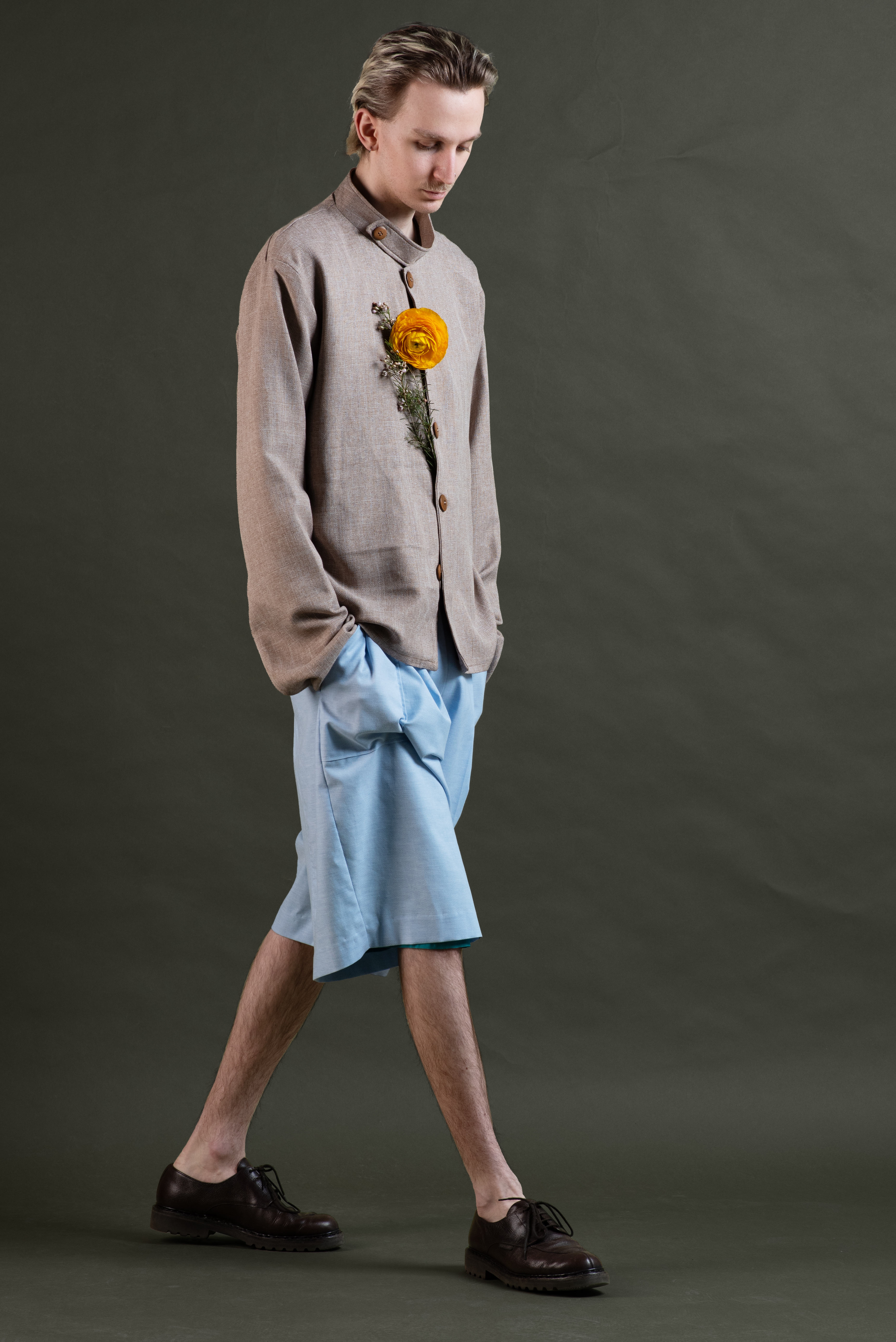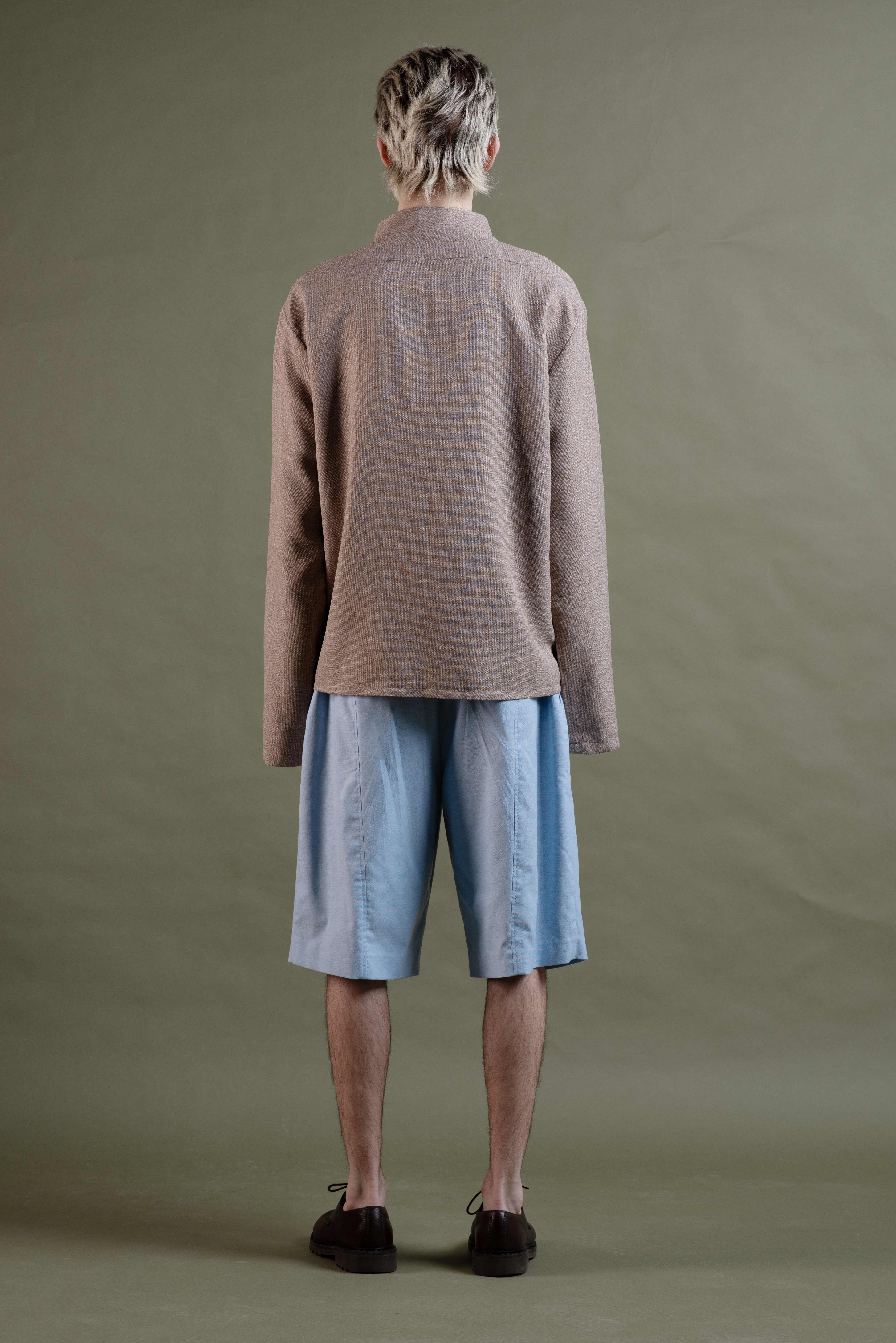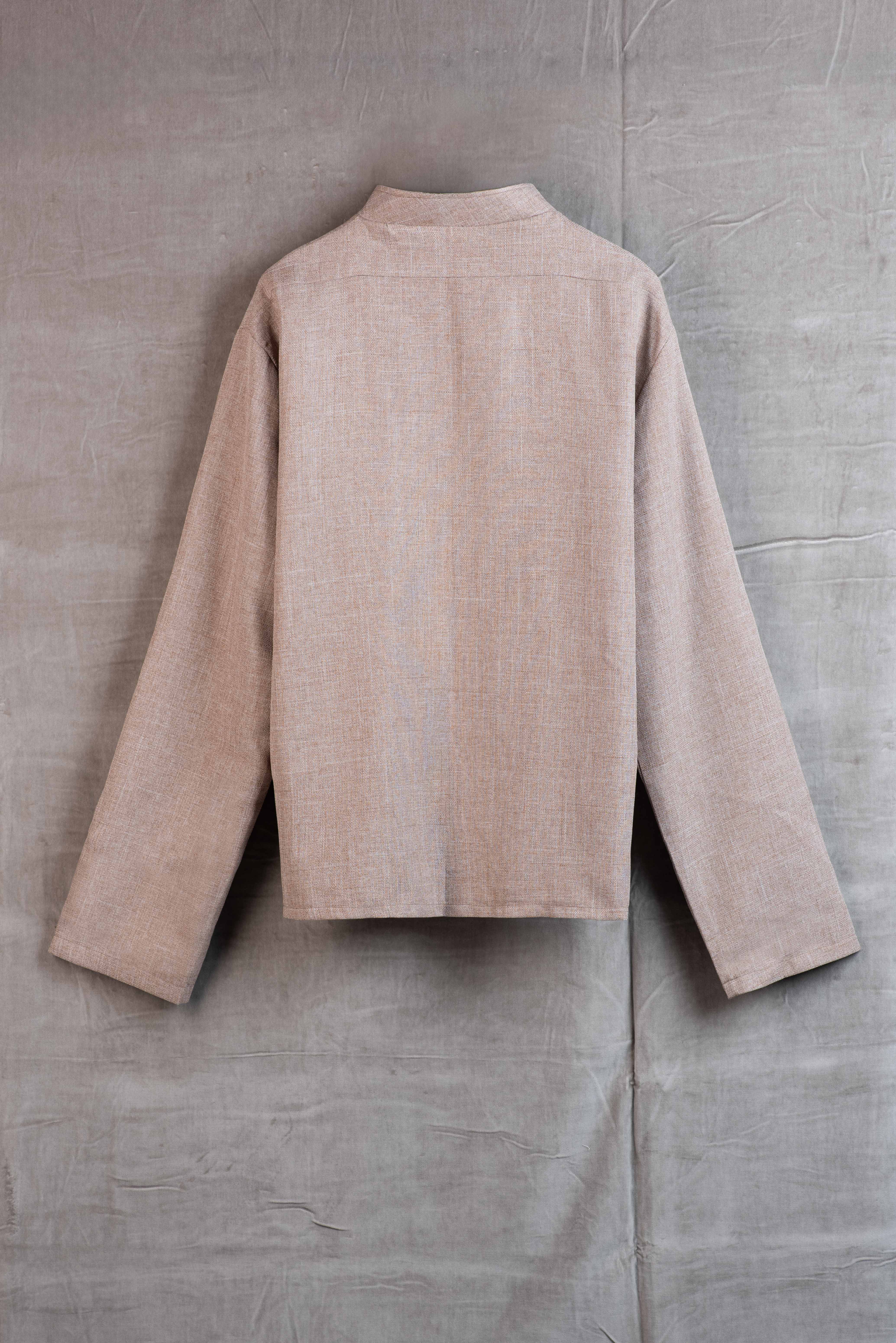 The stand-up collar creates a sharp, modern silhouette, while the wooden buttons complete the sustainable design. Whether worn as a lightweight jacket or an overshirt, Earthshade combines comfort, functionality, and timeless elegance.